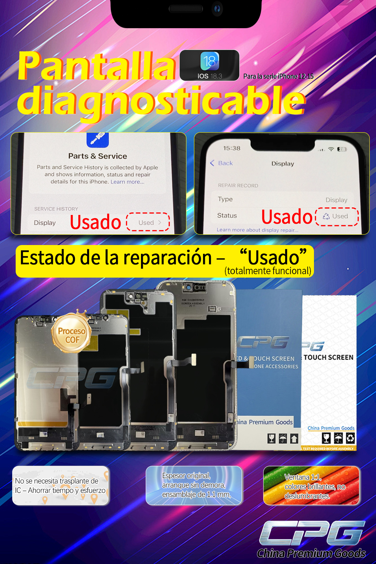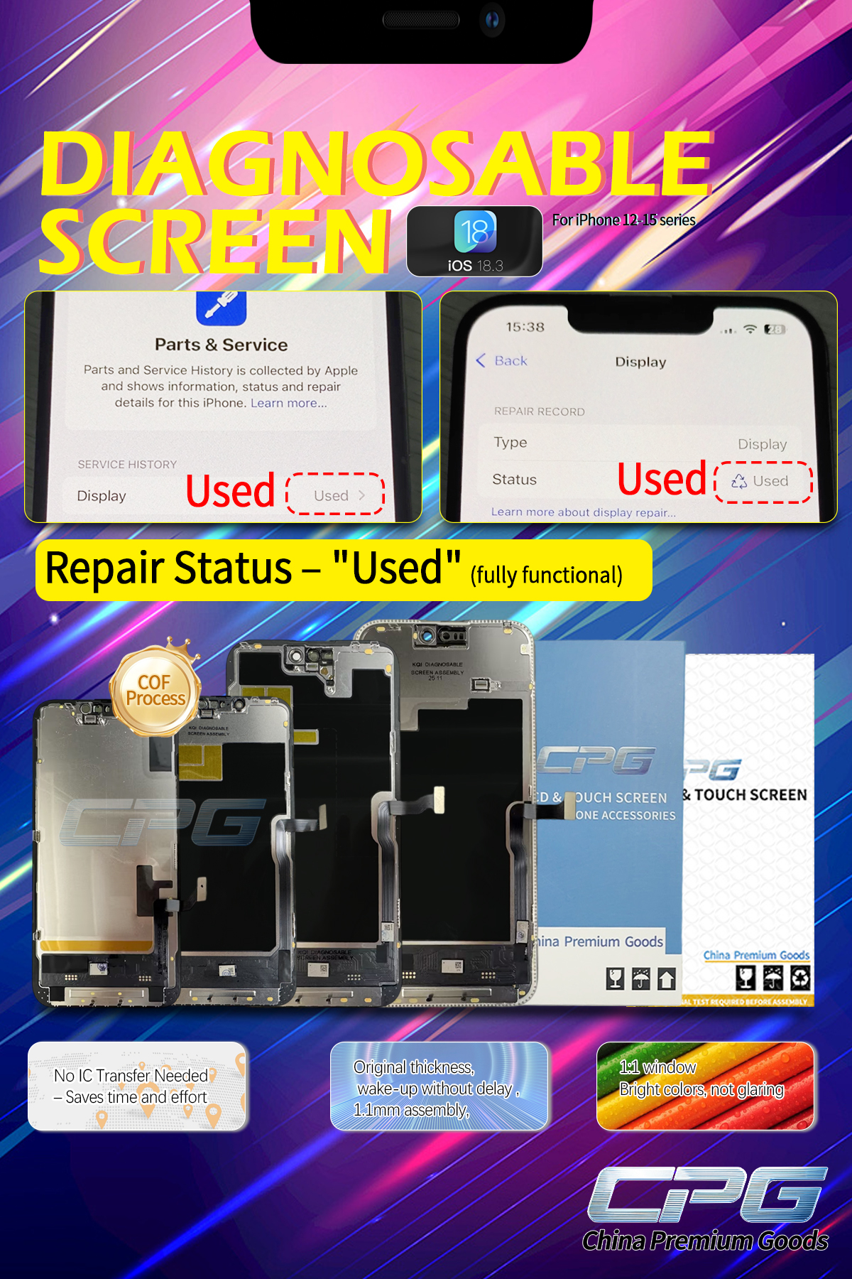 This diagnostic screen is an innovative accessory launched by CPG (China Premium Goods), dedicated to providing high-quality replacement screens for the iPhone repair market. CPG not only focuses on technological innovation but also maintains strict quality control to ensure that every screen meets user needs and extends the phone's lifespan. In summary, with the continuous advancement of iPhone repair technology, this new diagnostic screen undoubtedly represents a revolutionary step forward for the repair industry. It not only improves repair efficiency but also provides users with greater transparency and reliability. Moving forward, with the continued updates to the iPhone series, CPG will continue its commitment to launching higher-quality, more powerful repair parts, helping consumers and the repair industry better adapt to the rapidly changing technology market.