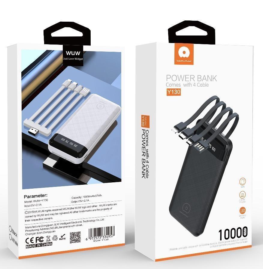 Stay connected and powered up effortlessly with the WUW Y130 Power Bank 10000mAh Fast Charging USB+Lightning+Type C+Micro. Your perfect companion for staying ahead in the fast-paced digital world.